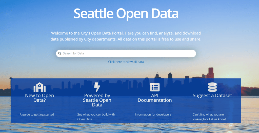 I thought about what kind of data would be interesting to analyze. I looked around at the City of Seattle’s Open Data portal and found a dataset of pedestrian and bicycle counts at a local park which interested me, because I am a transportation planner. If you Google “open data” + your city’s name, you will probably find something similar.