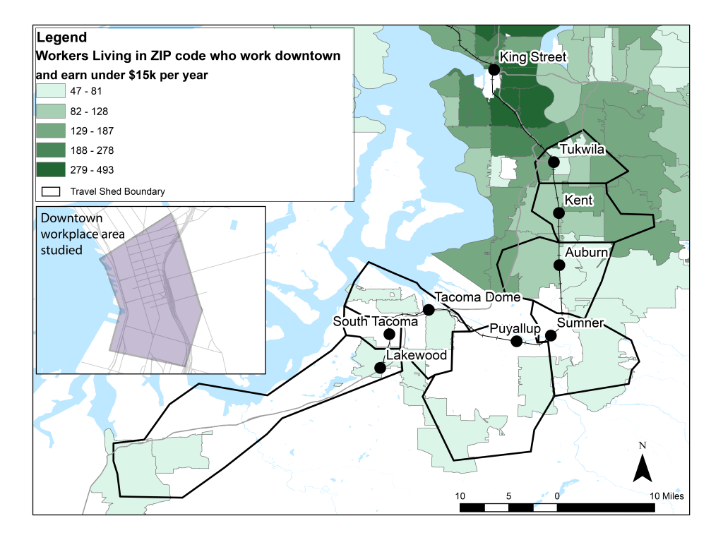 For the analysis shown here, I wanted to look at people who work downtown and earn very low wages (under $15,000 per year). These include restaurant and hotel workers, among others. Where do those people live? It was relevant because my agency’s commuter rail, Sounder, primarily serves people commuting to downtown Seattle, and I wanted to understand how well it is serving people with very low incomes. How many of them live within the areas from which Sounder riders typically commute (outlined in black)? It turns out, not very many. They tend to live in either South Seattle, or east or north of the city, outside the extent of this map. So Sounder won’t help them much, but we run other transportation services from those areas and now we have a better sense of some of those communities’ needs.