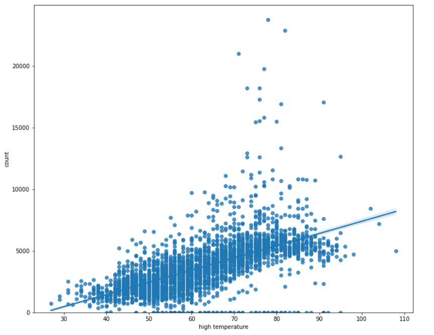Now I start trying to make a model that explains what accounts for differences in crowds. Here’s a scatterplot with daily high temperature and count, and a first attempt at linear regression: